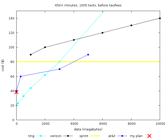 I retreated back to the problem I’m personally interested in: Should I switch? Note that this plot does not include the significant (or subsidized) cost of a phone. I use about 500 minutes of voice a month and send more than a hundred texts. How much data can I use before Ting is no longer the optimal choice?