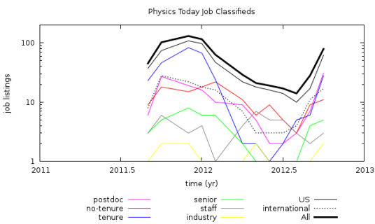 What counts as a job, in the counts above? An advertisement for “several” positions, without quantitative reference to assured positions, counts as one. “Two or more” positions count as two. Blunderbuss advertisements from National Labs count as one (they typically have many positions open, and I’m not convinced that the ~four highlighted jobs reflect the number of open positions). Only post-graduate positions count.