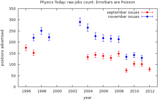 Chatting with Dr. Tolich about the plot brought to light an important systematic concern: Free online advertising is becoming prevalent (SPIRES has a job mill, and there are others (edit to add one: academicjobsonline.org )). The minimum charge for a Physics Today ad is $525. There are rumors that at least one major department discussed not placing a print ad for recent positions on cost concerns. If job seekers find jobs on the web, why pay for print? I’d never heard of the SPIRES listings, so at least some luddites still prefer print.