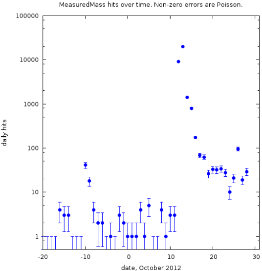 Edit: 10/30/2012. After the post regarding Hurricane Sandy, this experiment had to end; traffic from the new post started to matter. These numbers are the total hits to all-things measuredmass, not just the Google post. So, the above is the final plot.