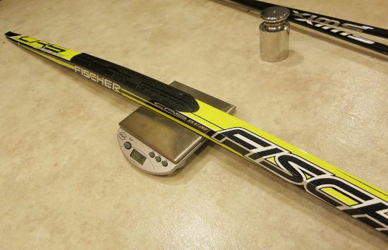 If you’re looking at the photos, the 2000/2006 g calibration factor applies to this scale. One ski weighed in at 700 g, the other at 708 g. With the usual caveats (2 measurements is a poor way to sample a distribution), this comes to 704±7 grams for each ski. I can’t find a spec from Fischer for the 192 cm ski.