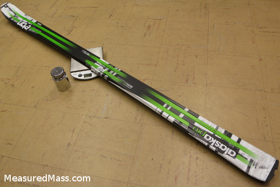 These skis are 1162 and 1145 g. So, the pair weighed (with the usual calibration and 2-point concerns) in at 1153±15 grams. This is easily consistent with their stated uncertainty. Thank you, Elan!