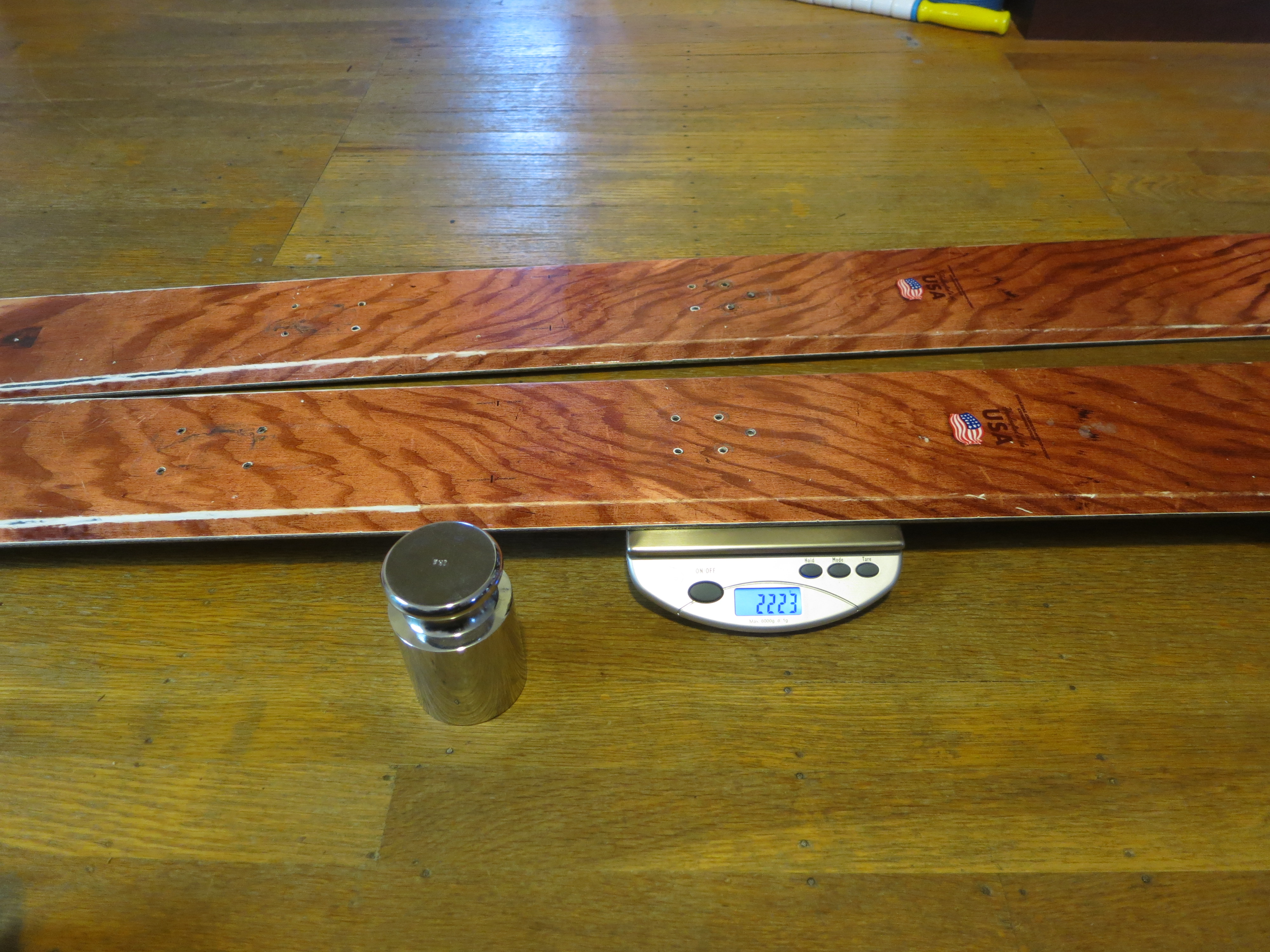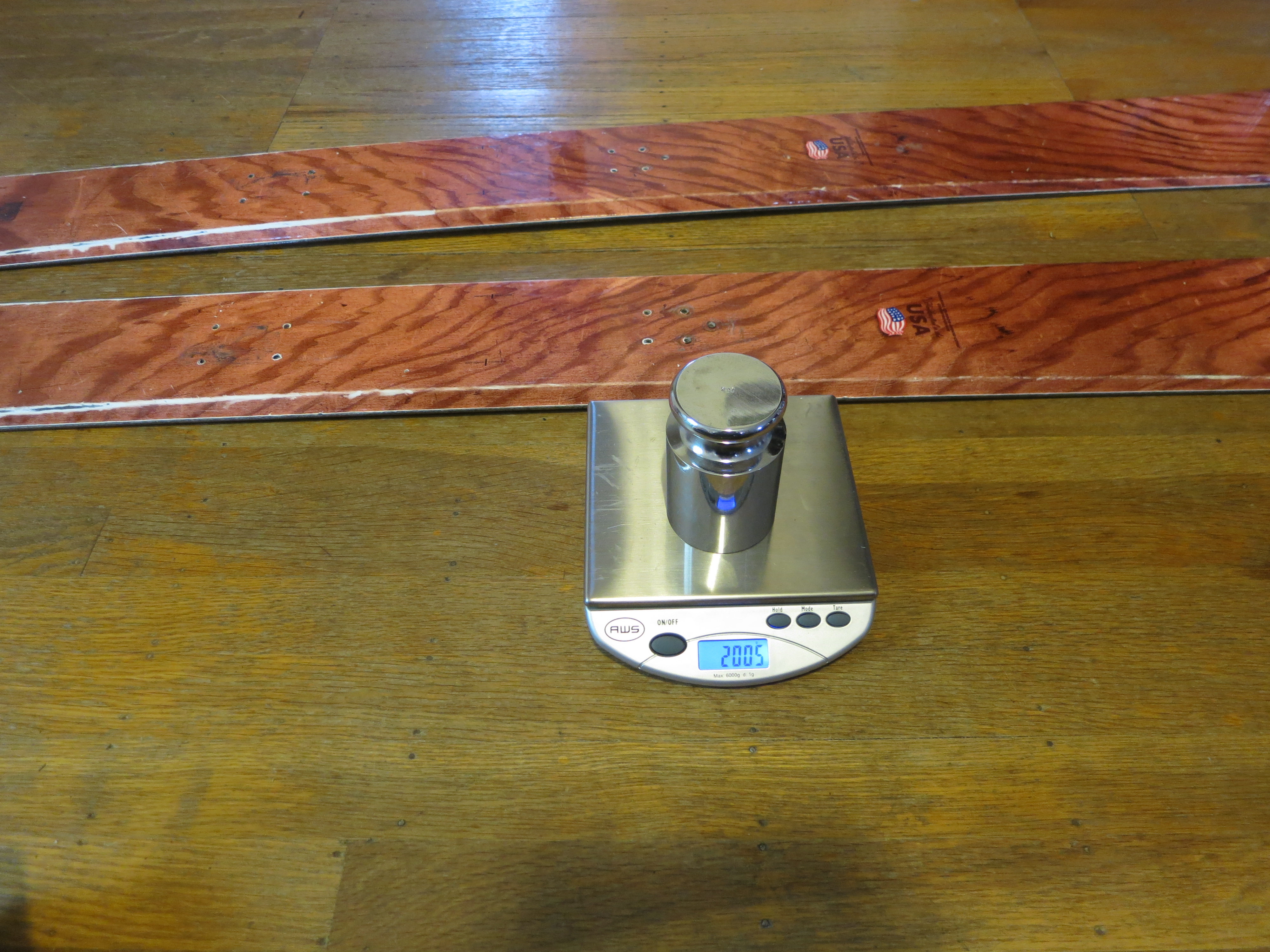 Weights: From the Wayback Machine in April 2010, the 192 claimed weight/ski was 2.11 kg/ski. The skis weighed in at 2231 and 2217 g, yielding 2224±12 grams. That’s 5% high, even with binding holes drilled and some wear; perhaps pre-production weights were overoptimistic.