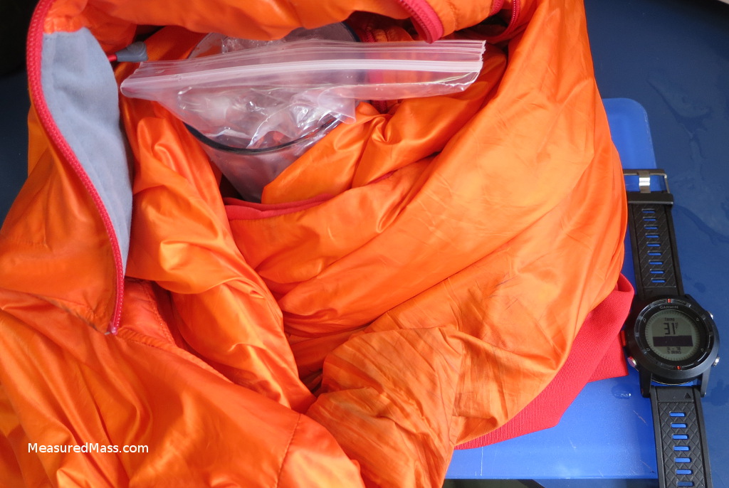 One NSAS glass, some water, some smashed ice, and a puffy-jacket later, and we have a low-quality calibration standard. I tossed the Tempe into a ziploc bag, along with a metal weight, and immersed it.