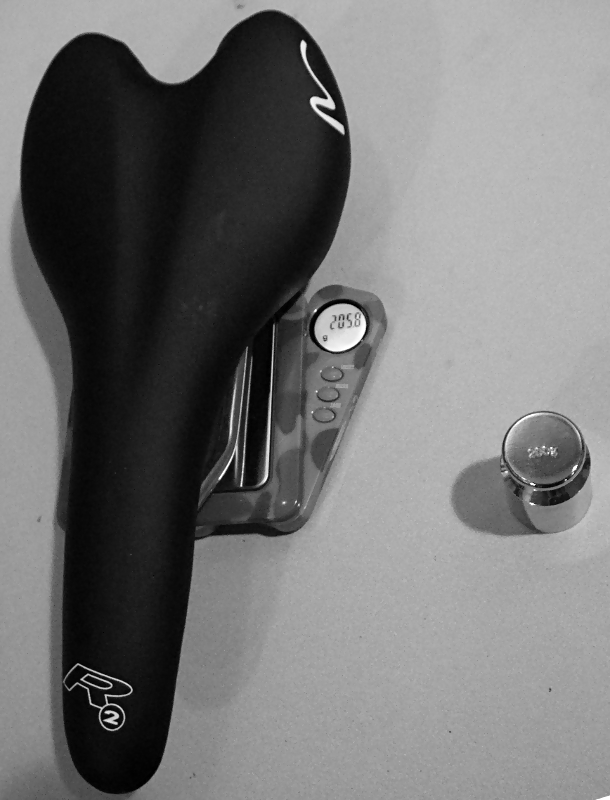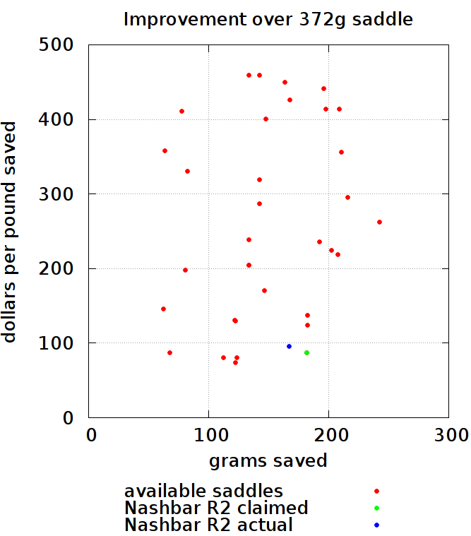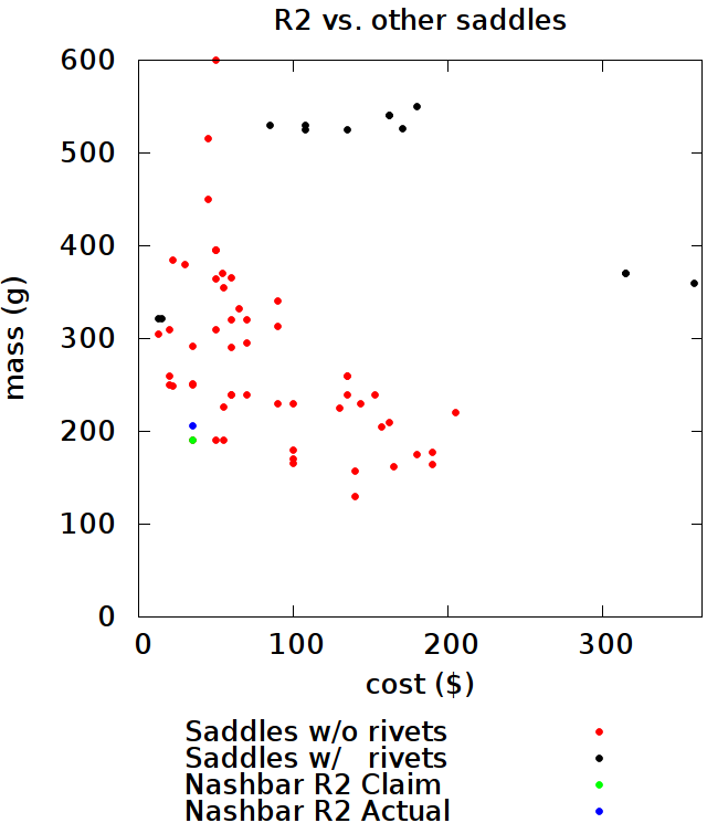 Reviews at Nashbar.com state that the saddle weighs 214, 208, 209, and 220 g. Averaging them together with the measured 205.8g yields 211 +/- 5.7 g. With only 5 samples and normally-distributed data, the uncertainty in the variance is considerable, and is slightly underestimated (by 7 %). Call it 211 +/- 6 g. Since Nashbar has lawyers, we don’t have very many samples, not all scale users know what they’re doing, and process variations aren’t always Gaussian, let’s double the variation, to 211 +/- 12 g (that’s almost an ounce variation, peak to peak). Using these data, if the saddle masses are “normally distributed”, less than one in ten saddles will have mass at or below 191g.