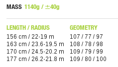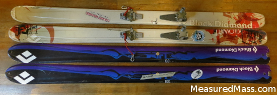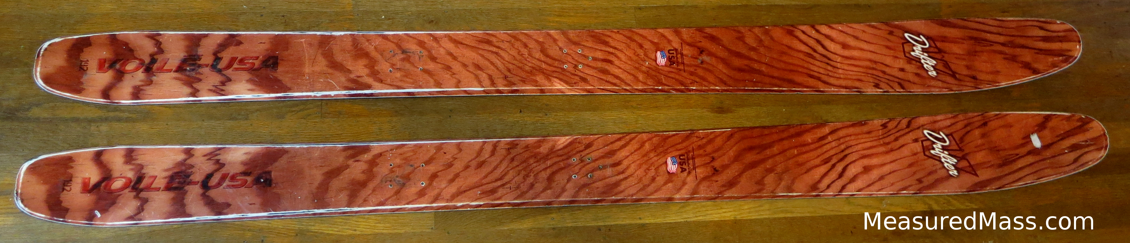 Weights: From the Wayback Machine in April 2010, the 192 claimed weight/ski was 2.11 kg/ski. The skis weighed in at 2231 and 2217 g, yielding 2224±12 grams. That’s 5% high, even with binding holes drilled and some wear; perhaps pre-production weights were overoptimistic.