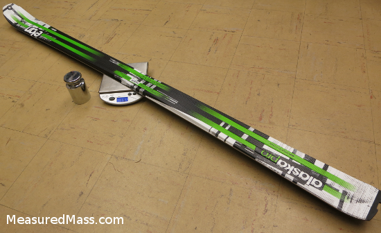 These skis are 1162 and 1145 g. So, the pair weighed (with the usual calibration and 2-point concerns) in at 1153±15 grams. This is easily consistent with their stated uncertainty. Thank you, Elan!